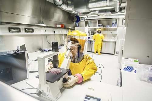 The CDC recognizes four levels of biosafety and recommends which pathogens should be studied at which level. Biosafety level 1 is for nonhazardous organisms and requires virtually no precautions: wear a lab coat and gloves as needed. BSL-2 is for moderately hazardous pathogens that are already endemic in the area, and relatively mild interventions are indicated: close the door, wear eye protection, dispose of waste materials in an autoclave. BSL-3 is where things get serious. It’s for pathogens that can cause serious disease through respiratory transmission, such as influenza and SARS, and the associated protocols include multiple barriers to escape. Labs are walled off by two sets of self-closing, locking doors; air is filtered; personnel use full PPE and N95 masks and are under medical surveillance. BSL-4 is for the baddest of the baddies, such as Ebola and Marburg: full moon suits and dedicated air systems are added to the arsenal.
