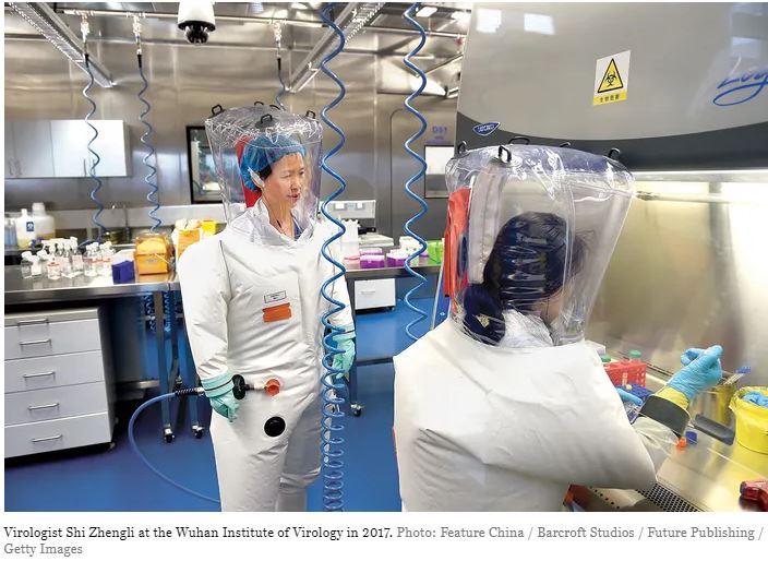 "Wuhan Institute of Virology, Wuhan, China (Zhengli Shi and Xingyi Ge) The Shi laboratory includes 4 rooms totaling (b) (4 , one equipped with two C02 incubators for tissue culture, one equipped facilities including with high speed centrifuge, 2 -20°C, 3 -80°C freezers, 2 PCR machines, 1 ELISA plate reader, one for molecule diagnosis equipped with two biosafety cabinets, and one normal laboratory equipped various small equipment items (mini-centrifuges, gel electrophoresis units, circulating adjustable water baths, and heat blocks). Also available to Dr. Shi's group is a fully equipped biosafety level 3 laboratory, a newly opened BLS-4 laboratory (the first in China) and Institute-supported facility center, which houses full-time staff and equipment for electronic microscopy, ultracentrifugation, confocal microcopy, and sequencing machine. Experiment conducted in BSL-2 Lab The FBI is the one agency whose views were identified in the Biden Report and it stated their was an accidental leak. Yet Carl Zimmer of the NYT continues to put one computer scientist's theory that the virus came from nature on the front page. Daszak is the number one proponent of the "it came from nature" theory to protect himself. Afterall, how could it be co-incidence that of all the places to first break-out, it was in the same city Daszak's experiments were being conducted on Corona viruses? WSJ on the Lab Leak theory