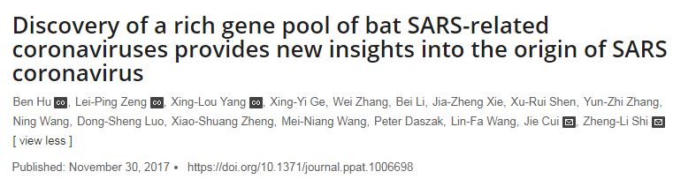This entry (above) refers to https://journals.plos.org/plospathogens/article?id=10.1371/journal.ppat.1006698f DATED NOVEMBER 30, 2017: Daszak claimed this experiment was funded by USAID, NIH etc. This is a lie. It was funded by the ChiComs. Ben Hu, Lei-Ping Zeng, Xing-Lou Yang, Xing-Yi Ge, Wei Zhang, Bei Li, Jia-Zheng Xie, Xu-Rui Shen, Yun-Zhi Zhang, Ning Wang, Dong-Sheng Luo, Xiao-Shuang Zheng, Mei-Niang Wang, Peter Daszak, Lin-Fa Wang, Jie Cui, Zheng-Li Shi.