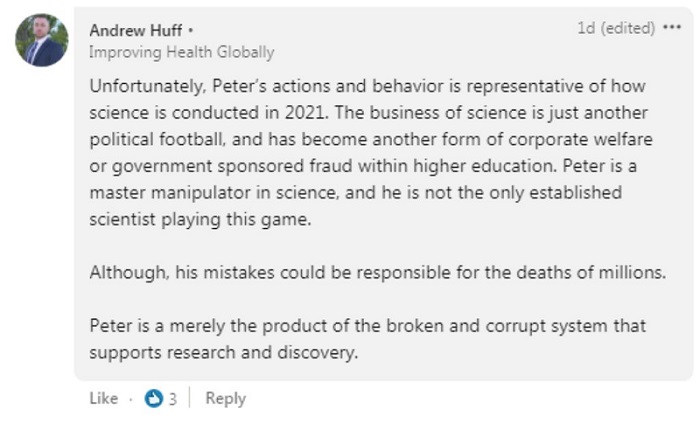 I contracted Covid-19 in March 2000. The medics had to beat on my chest to bring me back to life. I was in Lenox-Hill Hospital for a month with a lung tube. The disease left one of my fingers paralized making it hard to type. So I did some research which came down to this: Peter Cottonton Daszak deliberately and intentionally caused a pandemic by putting all the players in place then ignoring warning signs that would be apparent to anyone with his credentials. It's all here, all referenced with live links to my sources. 3/7/2025