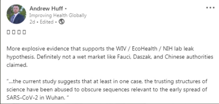 A group of virologists, many of whom receive funding from Fauci's NIH, or as we say in the venacular, were on Fauci's pad, wrote: "The suspicion that SARS-CoV-2 might have a laboratory origin stems from the coincidence that it was first detected in a city that houses a major virological laboratory that studies coronaviruses." They claim it started in the Wet Market there. A large city in China typically has a few hundred wet markets. Why this particular one near the WIV? If the disease came from rural China, as Daszak suggests, why didn't anyone get infected along the way? But because Trump the Hump said the pandemic was caused by a lab leak, it became a partisan issue.