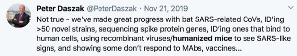 Most of the recombinant experiences were carried out by Baric and Shi financed by the NIH and Daszak's re-purposing of Eco-Health grants. NOVEMBER 21, 2019 Daszak tweeted: "We’ve made great progress with bat SARS-related CoVs, ID’ing 50 novel strains, sequencing Spike Protein genes, ID’ing ones that bind to human cells, using recombinant viruses, humanized mice to see SARS-like signs, and showing some don’t respond to MAbs, vaccines."
