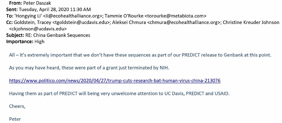 From: Peter Daszak Sent: Tuesday April 28, 2020 11:30 AM TO: Honging Li Tammie O'Rourke CC: Goldstein,Tracy Alekseia Chmura Christine Kreuder Johnson Subject: Re: China Genbank Sequences Importance: High All- It's extremely important that we don't have these sequences as part of our PREDICT release to Genbank at this point. As you probably heard this was part of a grant terminated by the N.I.H. https://politico.com/news2020/04/27/trump-cuts-research-bat-human-virus-china-213076 Having them as part of PREDICT will bring very unwanted attention to UC Davis, PREDICT and USAID. Cheers, Peter